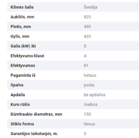 Ypatumai: nuimama juodos spalvos rankenėlė saugesniam naudojimui; reguliuojamas oro padavimas; su grotelėmis ir pelenų stalčiumi; galia: 5kW; apšildo iki 120 kv. metrų plotą; galima užsakyti jungtį oro tiekimui iš lauko; malkų ilgis - iki 35 cm; dūmtraukis jungiamas viršuje arba iš galo; korpusas dažytas juoda spalva.