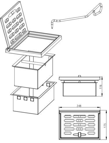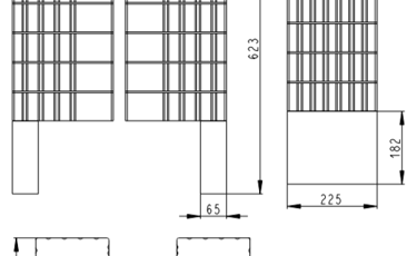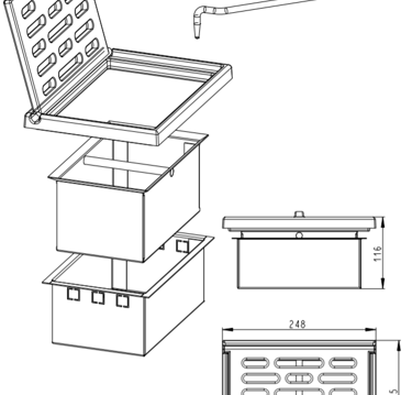 Grotelės su pelenų dėže, montuojamos degimo kameros apačioje. Sujudinus groteles, pelenai nubyra į pelenų dėžę.