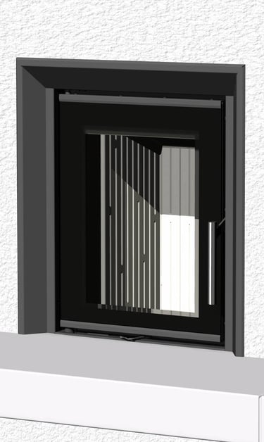 ROMOTOP MAMMOTH akumuliacinių akmenų rinkinys, skirtas Romotop židinių ugniakurams, kurių dūmtraukio skersmuo 200 mm, o durelės pakeliamos.